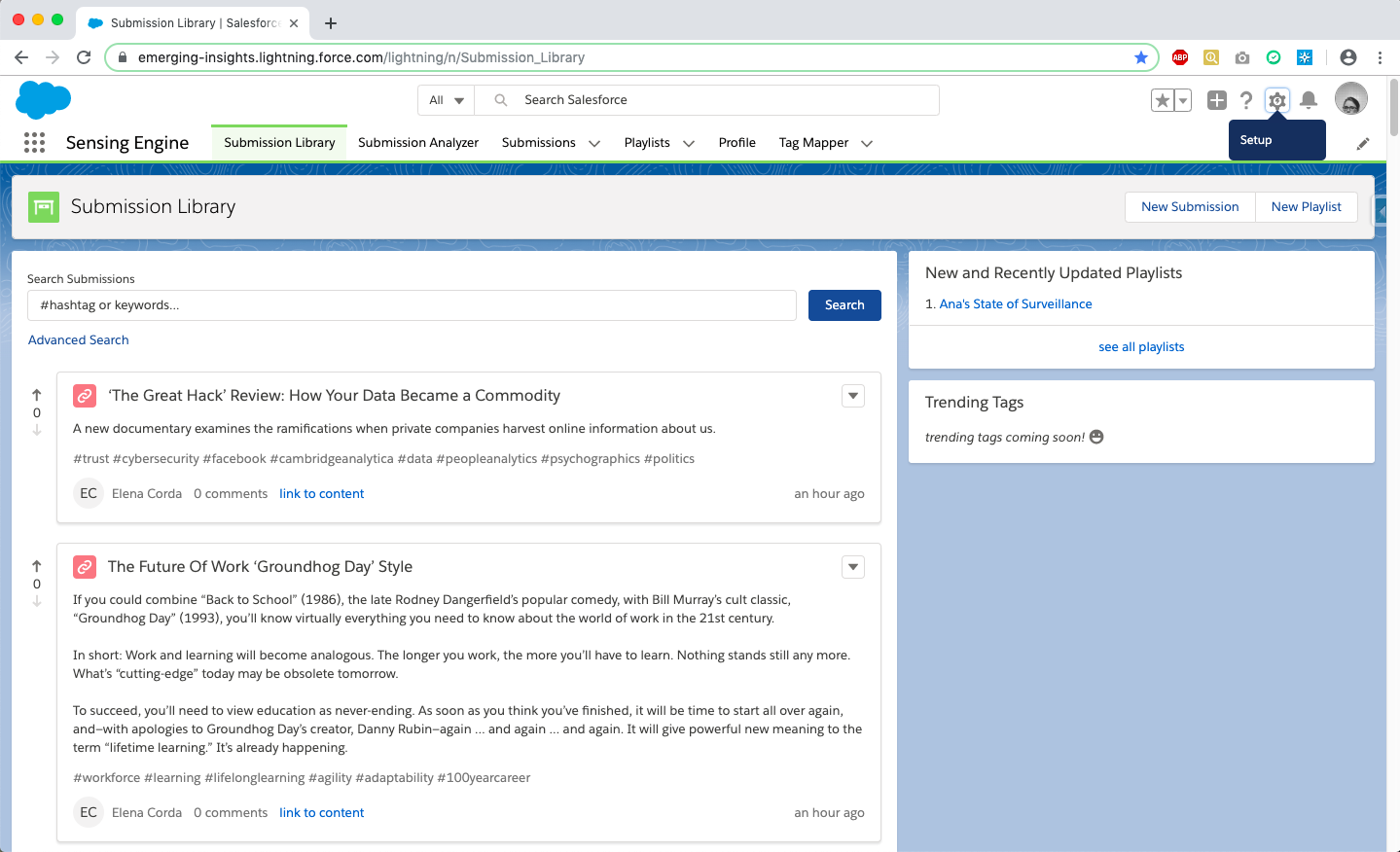 The Sensing Engine features a custom Salesforce app that offers real-time feeds of document submissions, analytics, trending reports, and searchable content. It also includes Record Cards for detailed descriptions of supported content types.