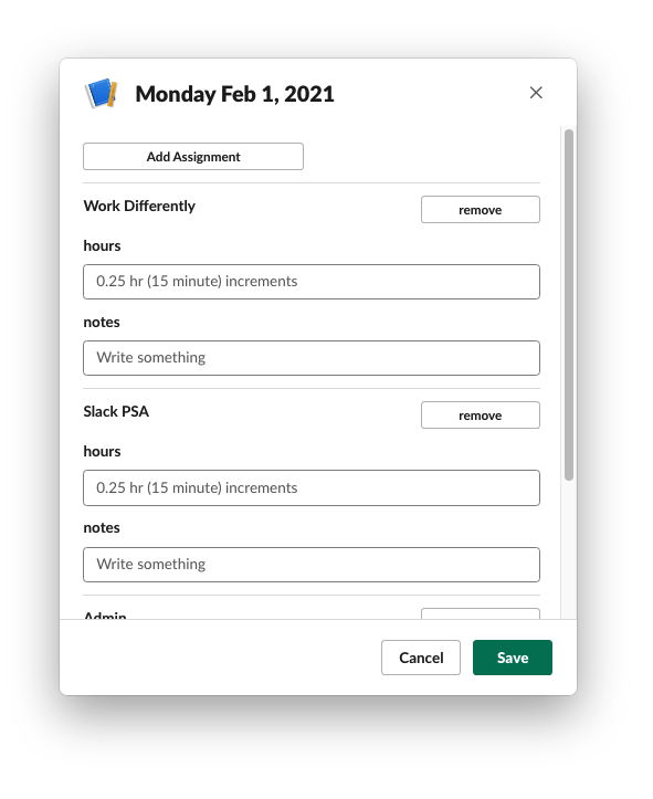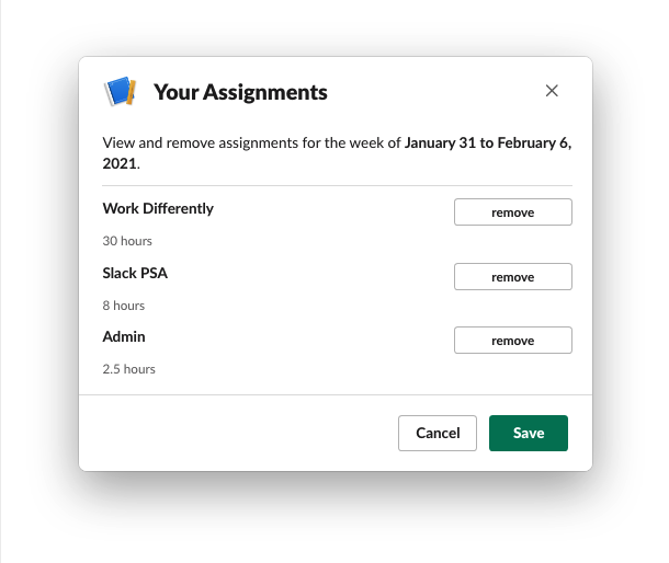 When our team was told to start recording their work into a time management application, internally developed with unintuitive interface and prone to error, our tech team was asked to build something on Slack since it was recently acquired by the company.